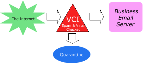 Email+ ServicesOur Email+ Services are composed of our VirusWatch and SpamWatch services to help protect businesses who maintain their own in-house mail servers. These services allow you to outsource your virus and spam needs to VCI allowing you to save time and money. Running an in-house mail server to block spam and viruses often requires expensive, proprietary software that normally only computer technicians can operate.Here's how it works. ![]()